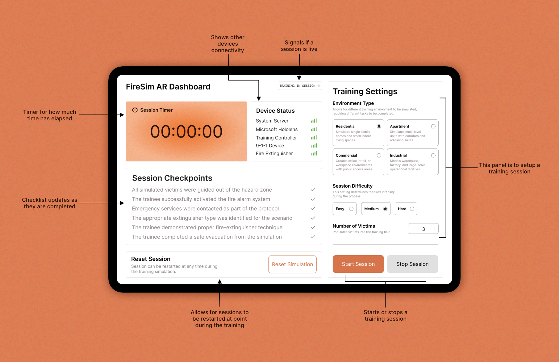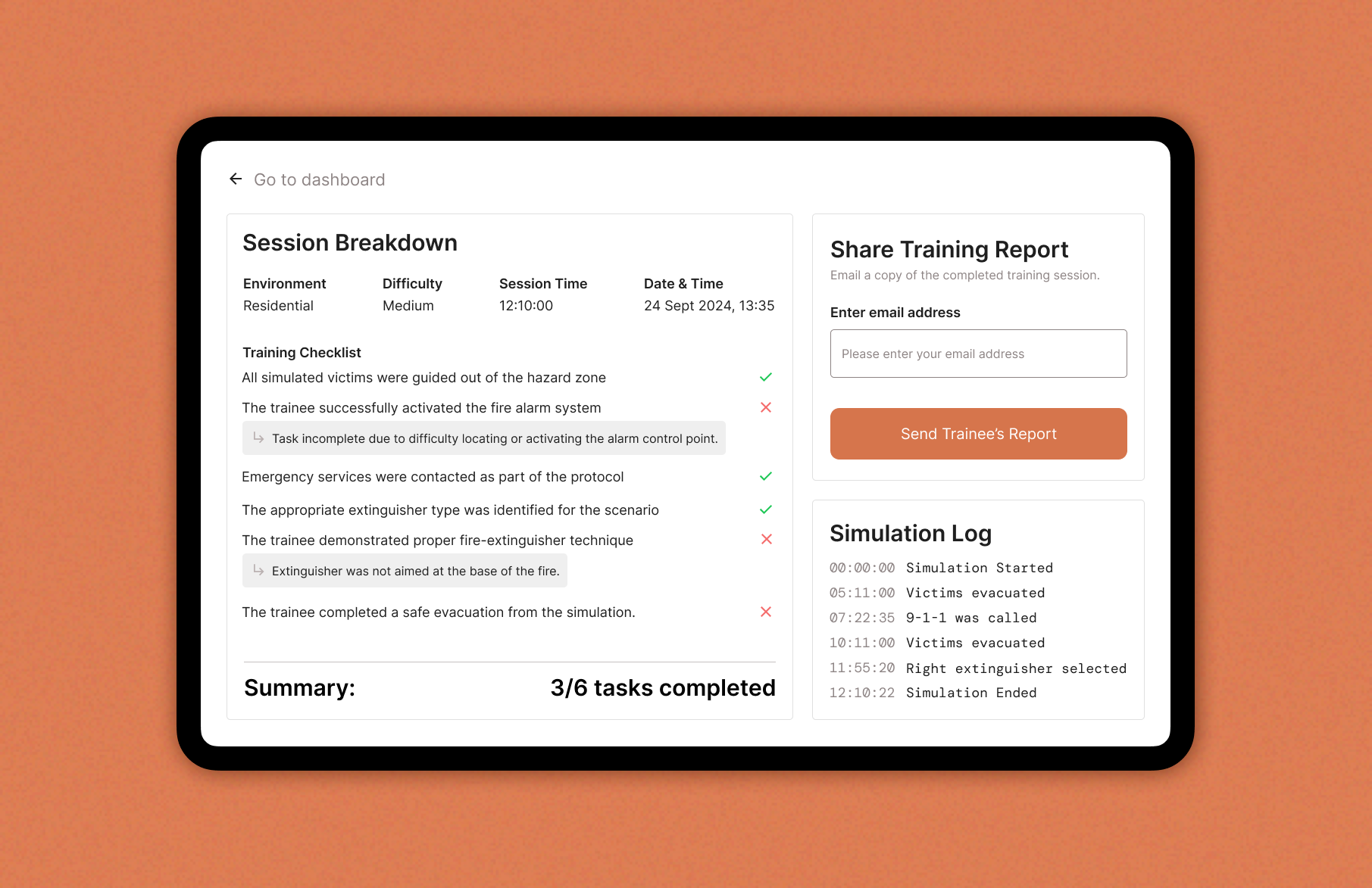 These decisions made the dashboard more intuitive and reliable during high-pressure scenarios. With the dashboard controlling the real-time simulation, trainers also needed a clear way to evaluate performance once the session concludes.