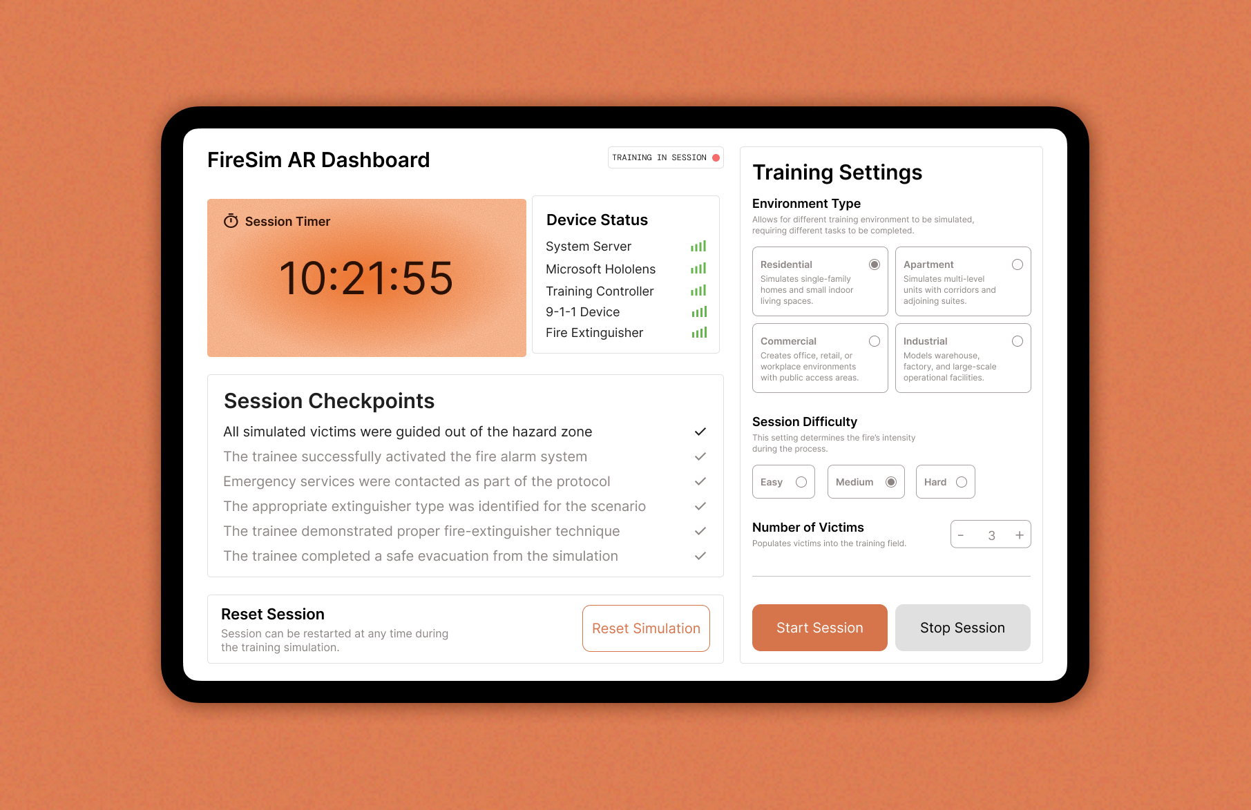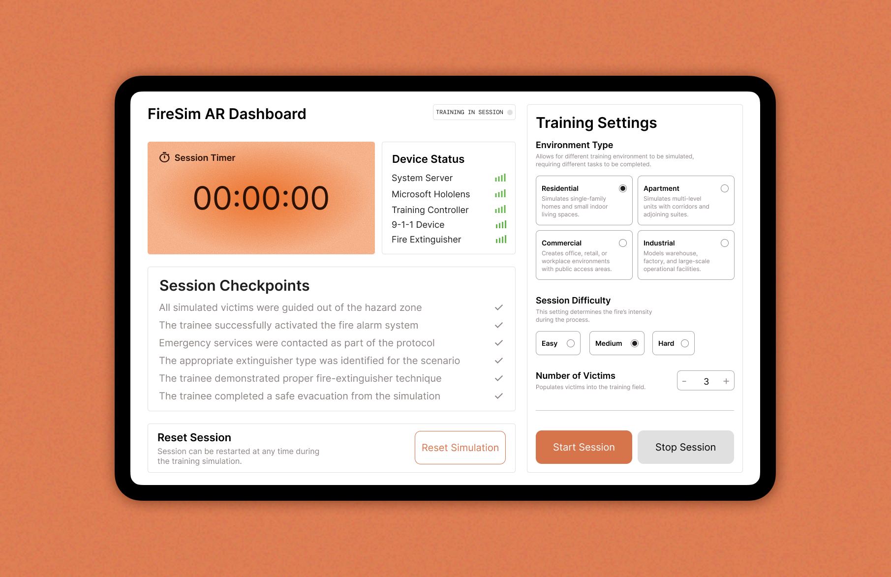 The project introduced a mixed-reality training system using the Microsoft HoloLens. My responsibility was to design and develop the primary control interface: an Android dashboard that allows trainers to set up, manage, and monitor fire-safety simulations in real time.
