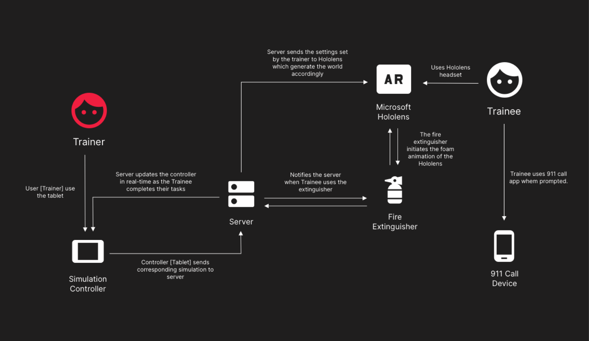 The platform brings together a trainer and a trainee inside the same simulated scenario, each playing a distinct role. Trainers oversee the session, adjust conditions, and monitor progress, while trainees navigate the experience through mixed-reality tools. The system breakdown below illustrates how both sides interact to create a coordinated, real-time simulation.